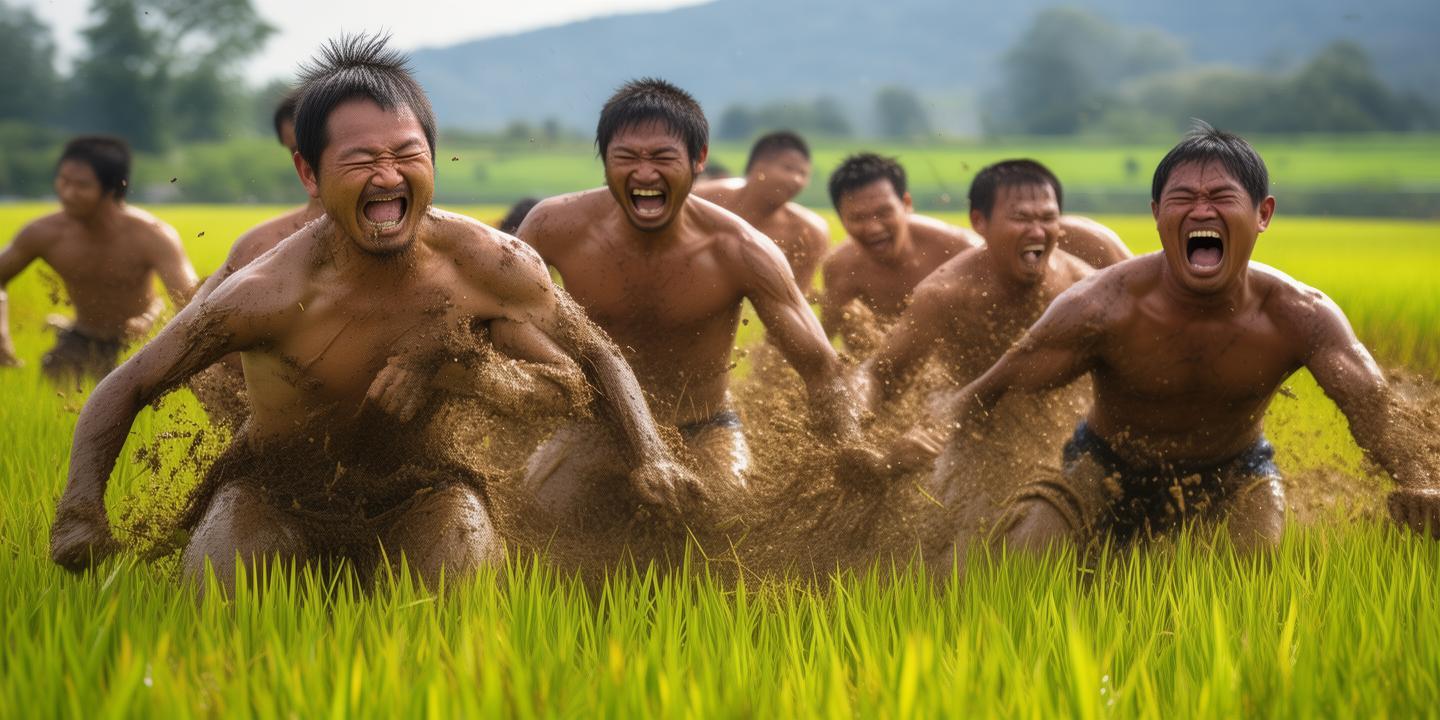 割稻结束后,农人们迎来了“开镰祭”的重头戏——泥地摔跤。这是一项具有浓厚地方特色的传统活动,吸引了众多村民前来观看。摔跤场上,两位选手赤膊上阵,相互较劲。他们身手敏捷,动作迅猛,不时引发观众们的阵阵喝彩。在泥泞的场地上,选手们你争我夺,争夺胜利的荣耀。