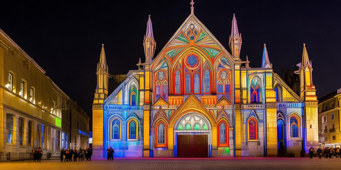 接着,灯光秀将焦点转向了教堂的西方建筑风格。在灯光的照耀下,教堂的尖顶、拱门、窗棂等元素,都显得格外优雅。尤其是那座高耸的钟楼,在灯光的映衬下,宛如一位高贵的骑士,守护着这座古老的教堂。